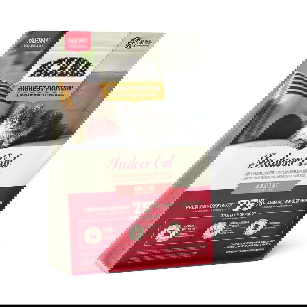 Acana Cat Highest Protein Indoor on erityisesti sisäkissoille suunniteltu viljaton kuivaruoka. Resepti sisältää 75 % eläinperäisiä raaka-aineita, kuten vapaana kasvanutta kanaa, kirjolohta ja lohta. Runsas proteiinipitoisuus auttaa ylläpitämään ihannepainoa ja lihaskuntoa, kun taas lisätyt pre- ja probiootit tukevat ruoansulatusta. Omega-3 ja -6 -rasvahapot huolehtivat turkin kiillosta ja ihon hyvinvoinnista.