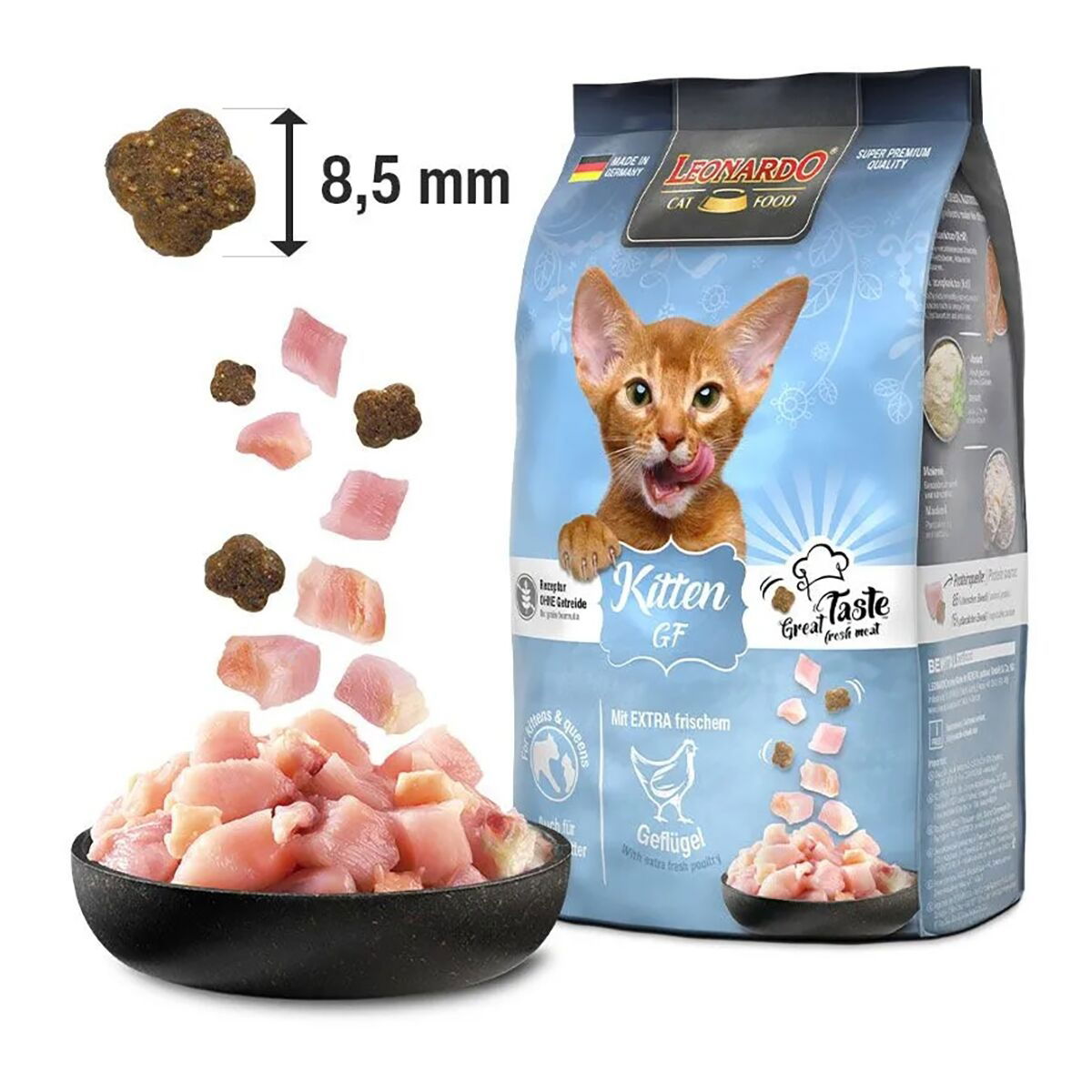 Leonardo Kitten Grain Free on erityisesti kissanpennuille (jopa 12 kuukauden ikään) sekä imettäville emoille kehitetty viljaton kuivaruoka. Se sisältää runsaasti tuoretta siipikarjaa ja makrillia, jotka tarjoavat laadukasta eläinproteiinia kasvun tueksi. Lisäksi ruoka sisältää ProVital™-immuunivahvisteseoksen ja STAY-Clean™-yhdisteen, joka auttaa ehkäisemään plakin muodostumista ja tukee suun terveyttä.