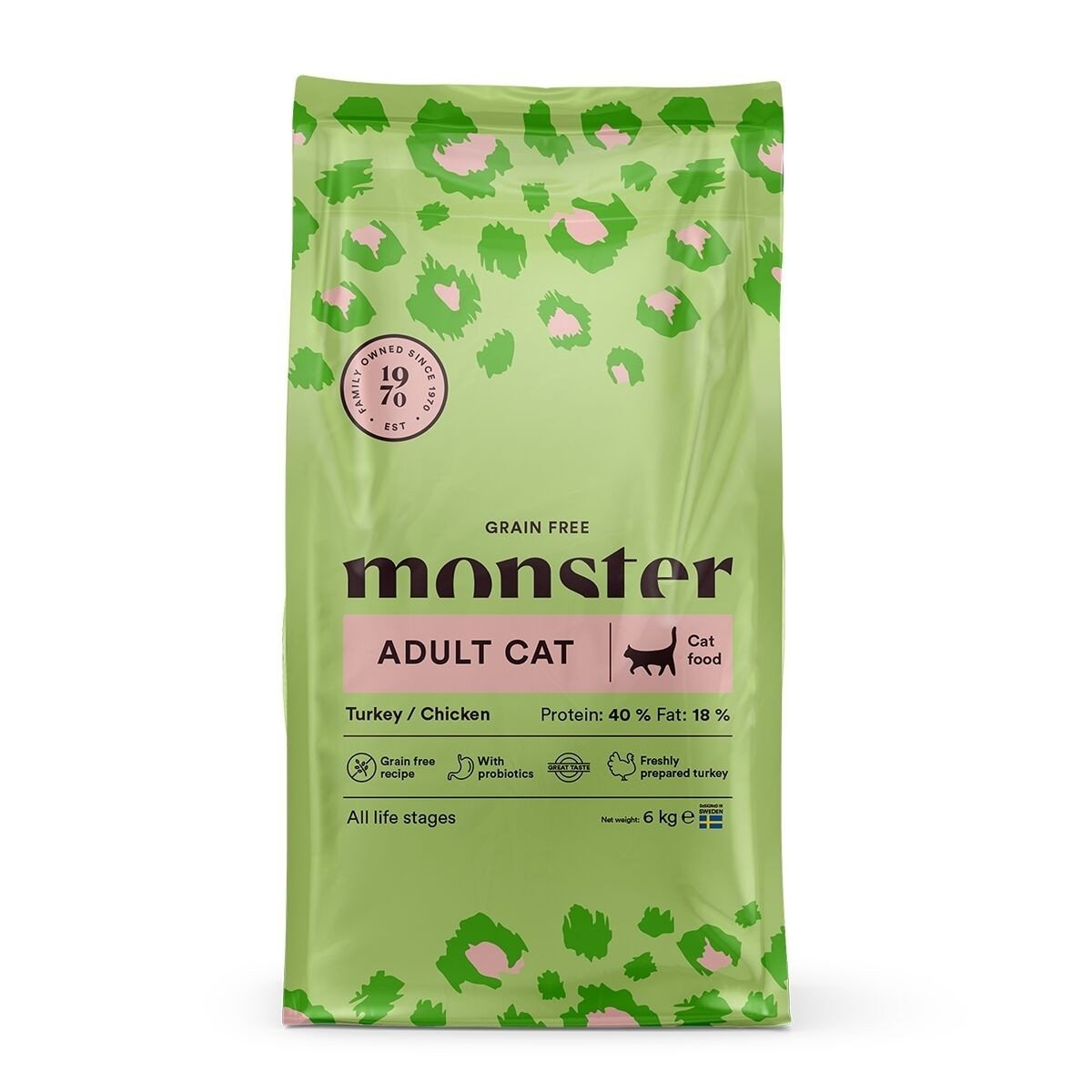 Monster Cat Grain Free Kalkkuna&Kana on viljaton kissan kuivaruoka aikuiselle kissalle. Lihaisassa kissanruoassa on 42 % kalkkunaa ja kanaa, jotka sulavat ja imeytyvät hyvin. Tuore kalkkuna antaa ruoalle herkullisen maun. Viljaton kissanruoka on hellävaraista ruoansulatukselle ja luonnollinen koostumus ei sisällä turhia lisä- tai väriaineita. Terveellistä ja maistuvaa!