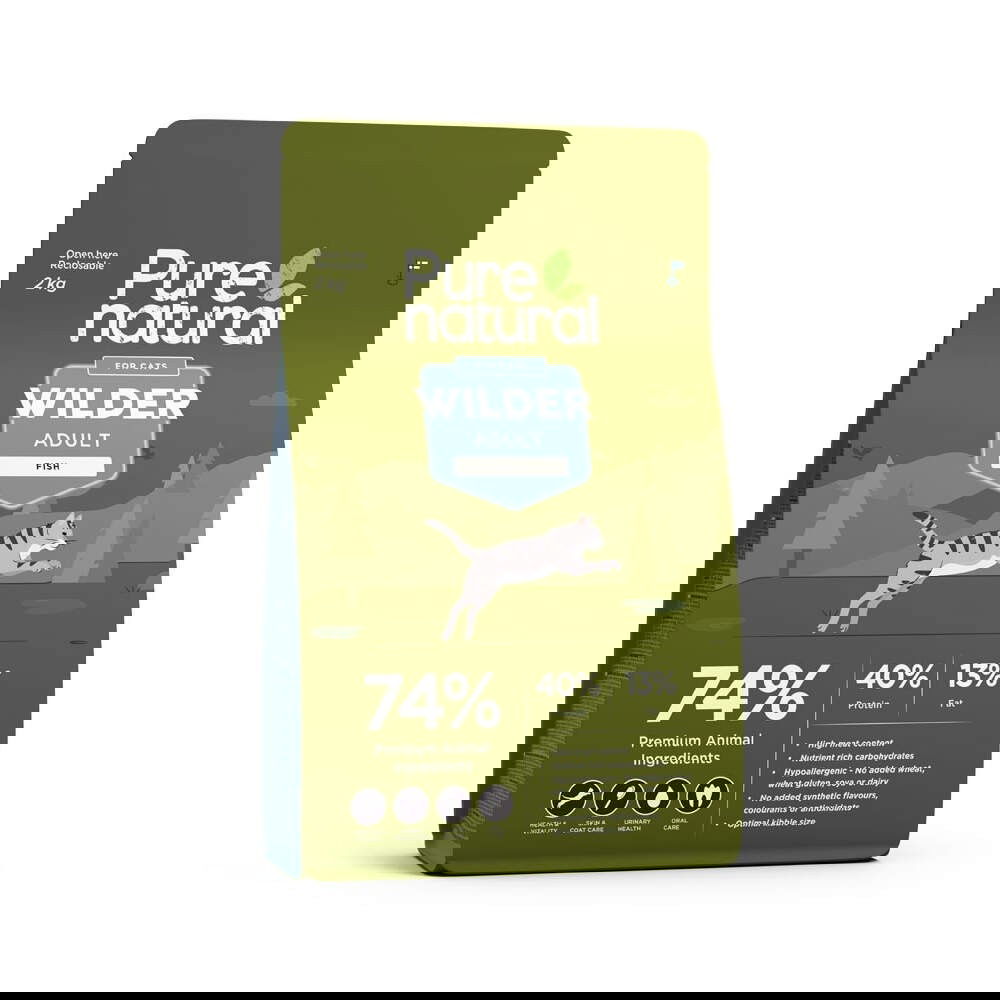 Purenatural Wilder Cat Adult Fish on tasapainoinen, kalaan pohjautuva kuivaruoka, joka tukee kissan ihoa, turkkia ja ruoansulatusta. Tuore valkoinen kala, silakka ja muikku tuovat luonnollista omega-3-rasvahappoa ja maistuvat kissoille erinomaisesti. Vehnätön kissanruoka lisätyillä prebiooteilla tukevat suolistoterveyttä ja tekevät ruoasta helposti sulavan.