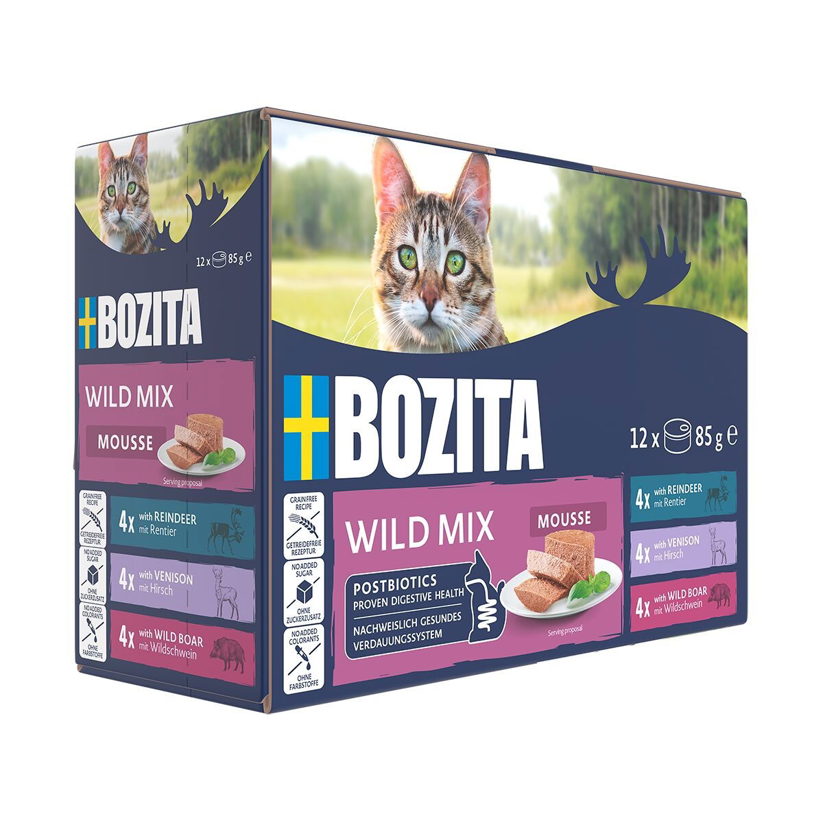 Bozita Mousse Mixed Wild 12×85 g tarjoaa kolmen riistamaisen maun setin: poro, hirvi ja villisika. Kaikki maut ovat täysravintoa ja tulevat pehmeässä, helposti nautittavassa mousserakenteessa. Viljaton kissanruoka ilman lisättyä sokeria tai keinotekoisia väriaineita sopii myös herkkävatsaisille.