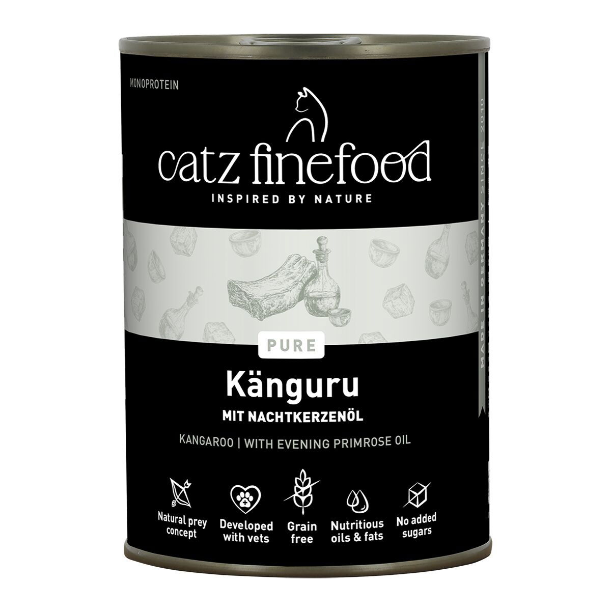 Catz finefood Purrrr N°107 kenguru – laadukas ja viljaton kissan märkäruoka, jossa ainoana eläinproteiinina on kenguru. Sopii erityisesti eliminaatiodieettiin kissoille, joilla epäillään ruoka-aineyliherkkyyksiä.