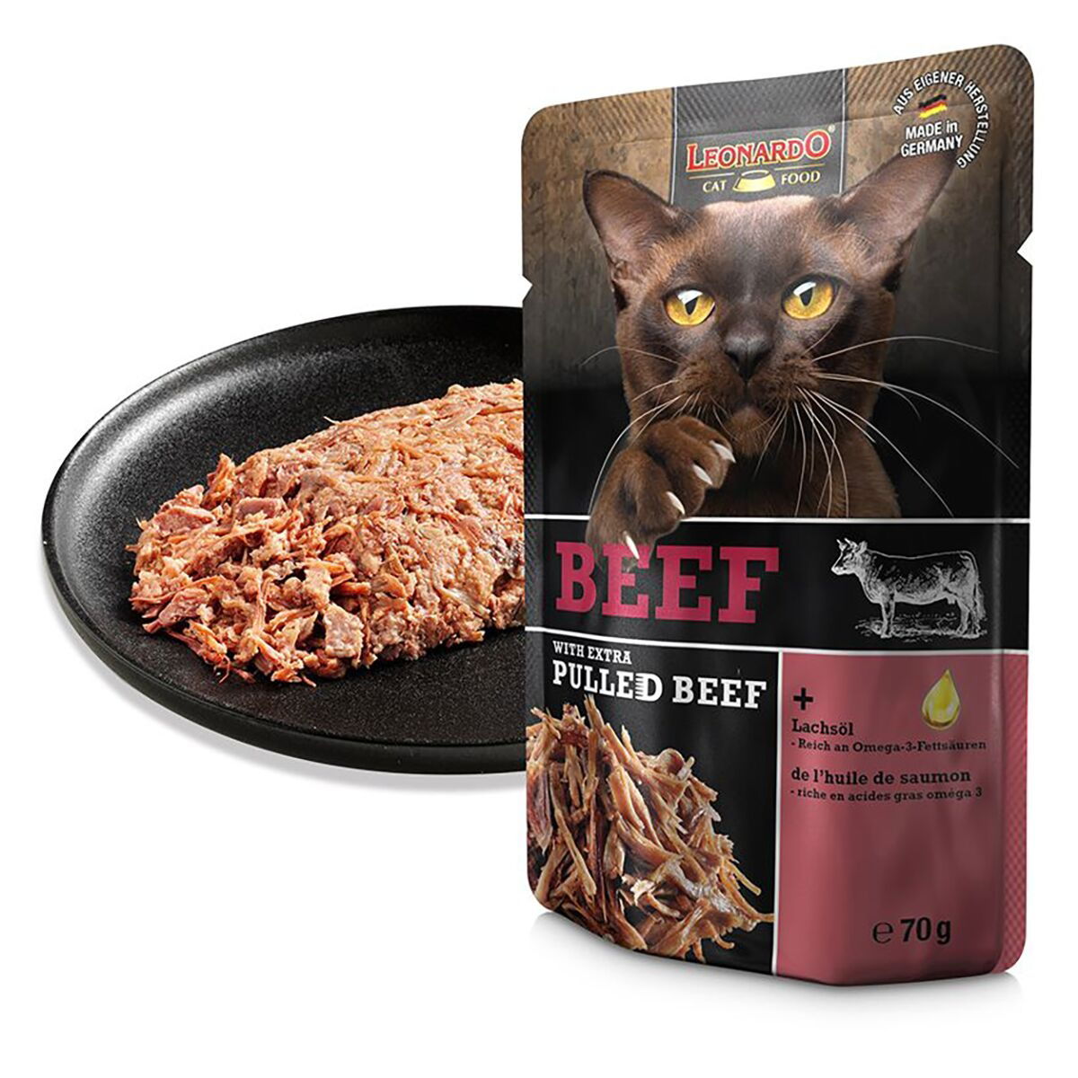 Leonardo Beef + Extra Pulled Beef -kissan märkäruoka yhdistää mehukkaan naudanlihapateen ja herkulliset nyhtönaudanpalat – täydellinen yhdistelmä täyteläistä makua ja rakennetta. Korkea lihapitoisuus tarjoaa laadukasta eläinproteiinia, ja lisätty lohiöljy tukee turkin ja ihon hyvinvointia. Täysin viljaton ja sokeriton kissan märkäruoka sopii myös herkille kissoille.
