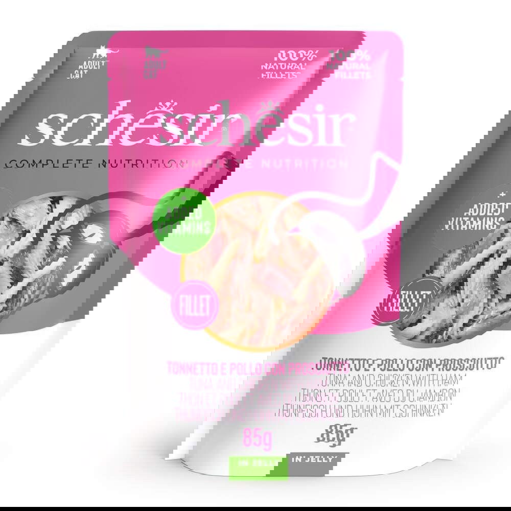 Schesir Tuna, Chicken & Ham in Jelly yhdistää tonnikalan, kanan ja kinkun yhdeksi maittavaksi täysravinnoksi. Pehmeä hyytelö tekee ruoasta houkuttelevan myös nirsoille kissoille.