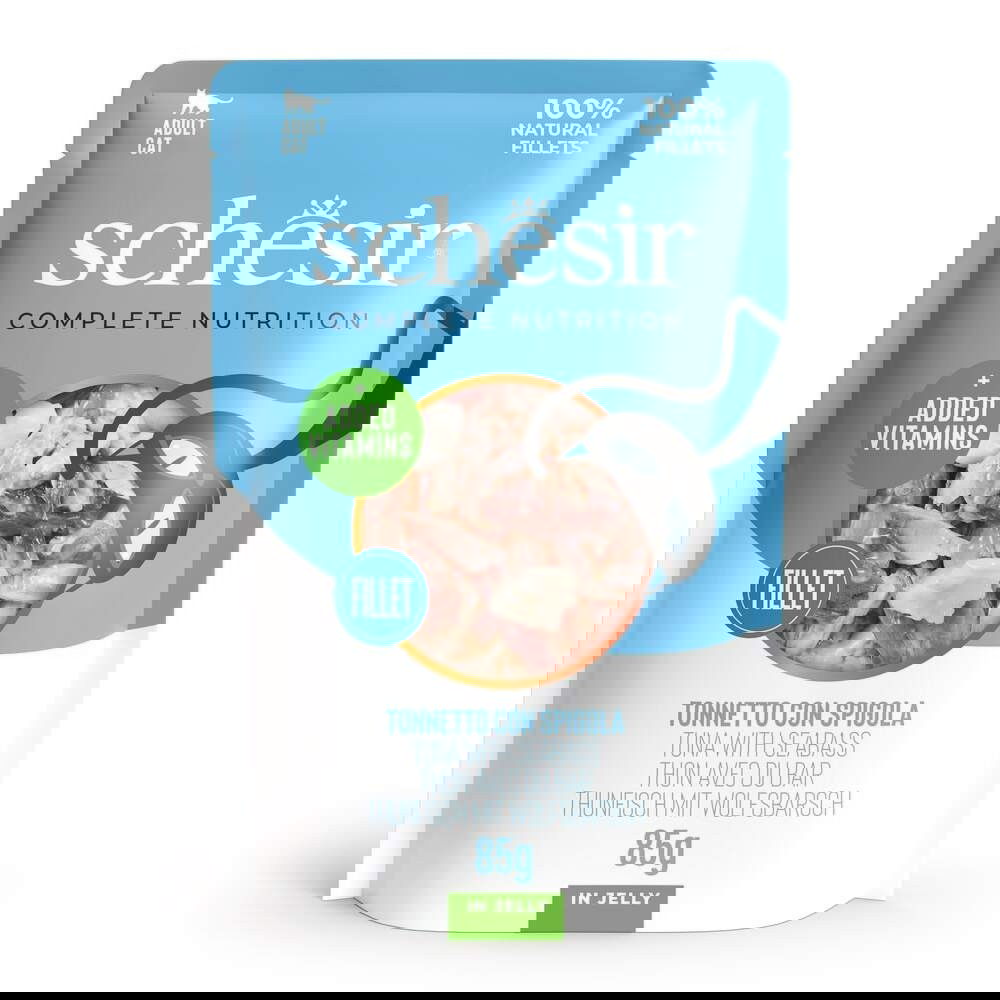 Schesir Tuna & Sea Bass in Jelly sisältää tonnikalaa ja siikaa hyytelössä. Korkealaatuinen täysravinto on luonnollinen ja herkullinen vaihtoehto päivittäiseen ruokintaan.