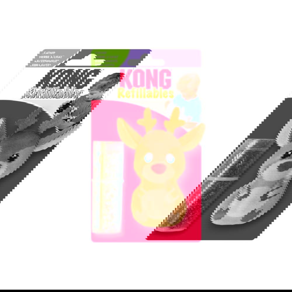 KONG Holiday Refillables Reindeer on pehmeä, täytettävä porolelu, jonka sisään lisätään mukana tulevaa Premium North American -kissanminttua. Lelun pieni koko ja pehmeä rakenne sopivat täydellisesti kantamiseen, ja porohahmo tekee siitä joulukauden suosikin. Lelun täyttöaukko on helppo avata ja sulkea tarranauhalla – leikki jatkuu aina uudella raikkaalla mintulla.