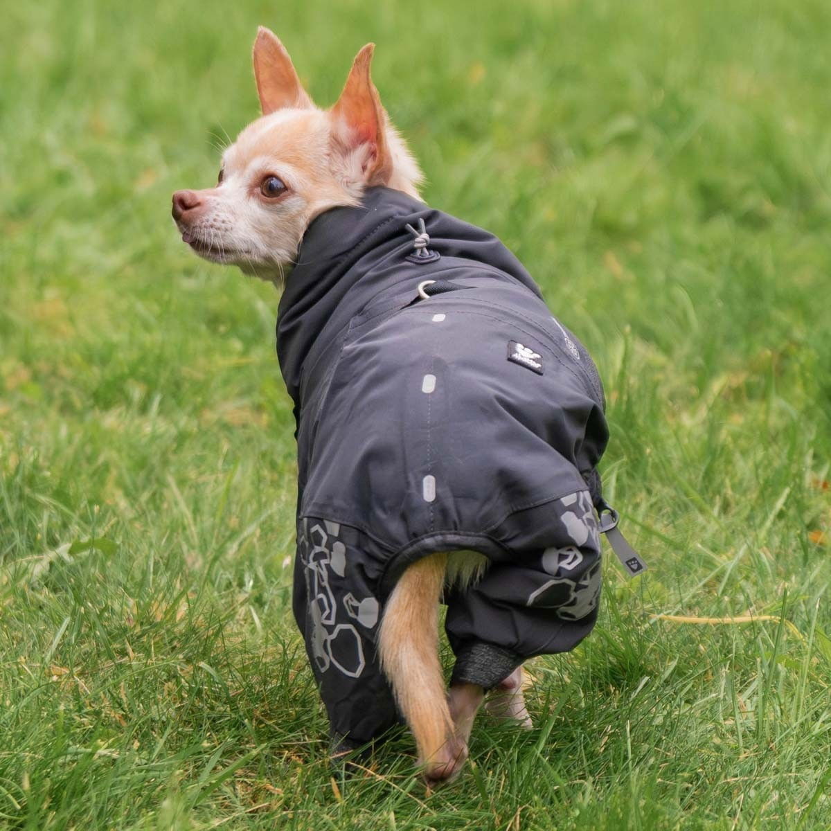Lahkeiden saumat on sijoitettu haalarin ulkopuolelle, jotta ne eivät hankaa koiran jalkoja. Haalarin sivussa sijautseva vetoketju ei paina koiran selkää ja se helpottaa pukemista. Säädettävä, korkea kaulus suojaa kylmältä viimalta. Heijastinprinttikuviot lisäävät näkyvyyttä mm. autoilijoille. Voit säätää noin 20 % haalarin selän pituutta, vyötäröä, rintamusta ja kaulusta.