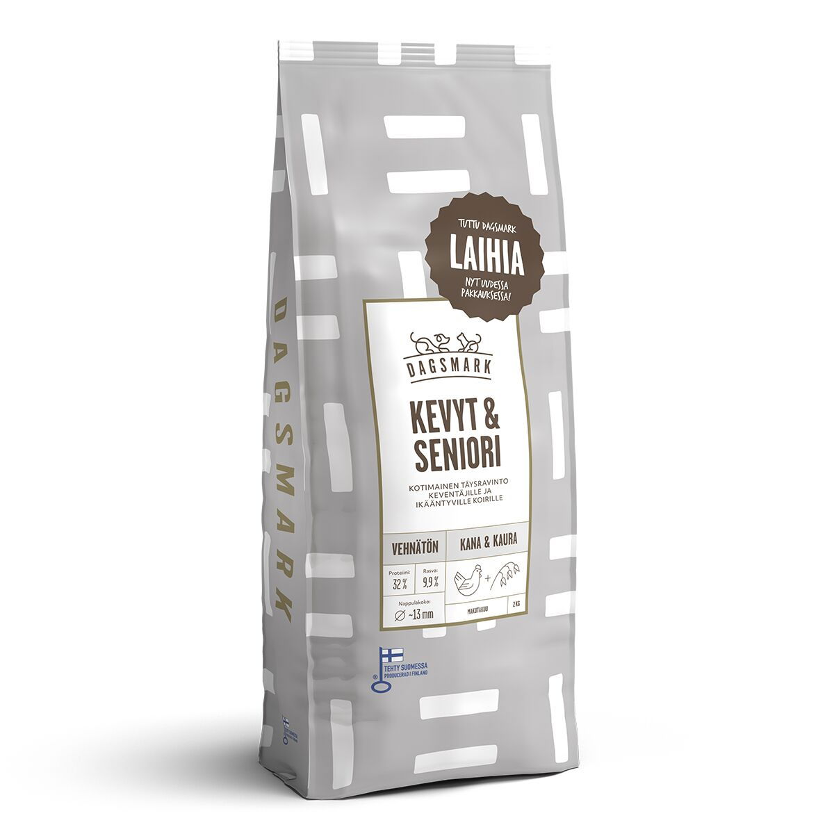 Dagsmark Kevyt & Seniori on kevyt, suomalainen koiranruoka aikuiselle koiralle. Vehnätön Dagsmark Kevyt & Seniori on vähärasvainen koiranruoka ja sisältää vain 9,9 % rasvaa: sopii painonhallintaan. Kotimainen koiranruoka suomalaisista raaka-aineista on ekologinen valinta. Dagsmark-koiranruoat valmistetaan Loimaalla.