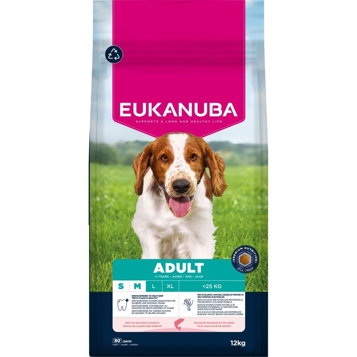 Eukanuba Adult Small & Medium Breed Salmon & Barley on koiranruoka alle 25 kg kokoisille ja 1-7-vuotiaille koirille ihon ja ruoansulatuksen tueksi.