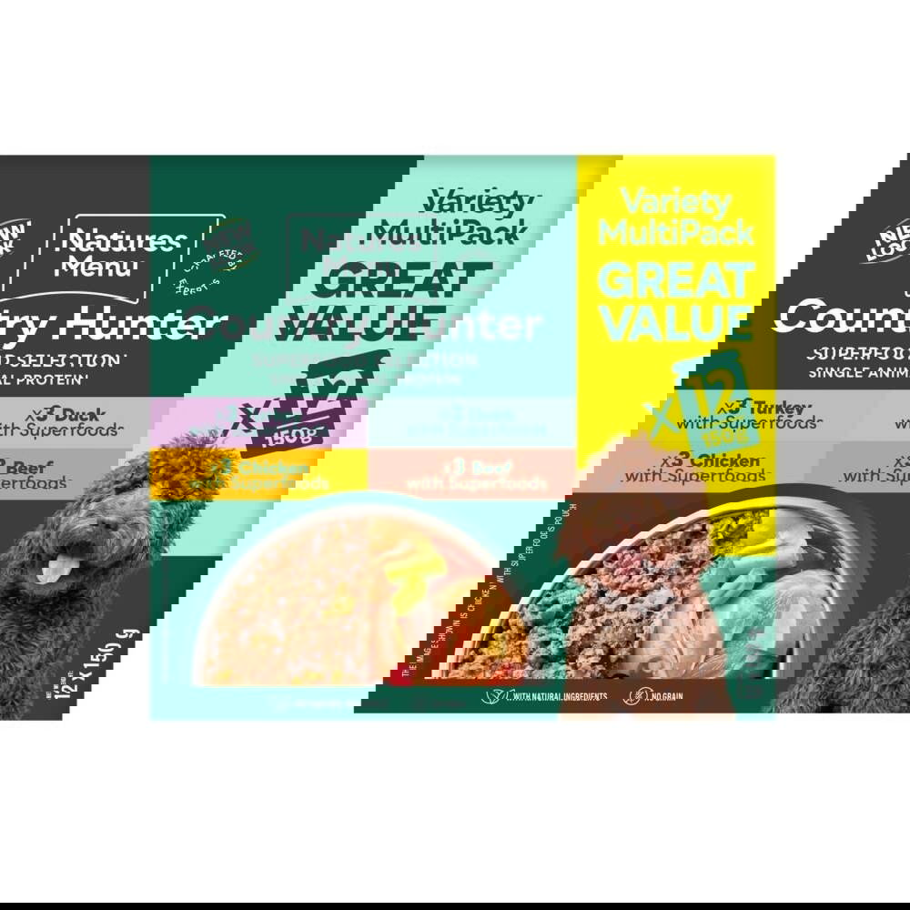 Laadukas Natures:menu Country Hunter -koiran märkäruoka on valmistettu ihmisravinnoksi kelpaavasta lihasta. Herkullisen lihan lisäksi täysravintoon on lisätty bataattia, porkkanaa, vihreitä papuja sekä ravintorikkaita kasveja ja yrttejä, mm. rosmariinia.
