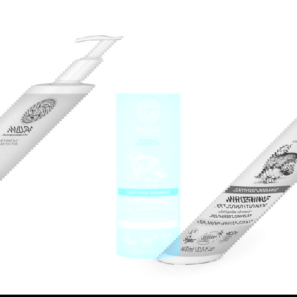 Wilda Whitening -hoitoaine auttaa pitämään valkoisen turkin puhtaan valkoisena.