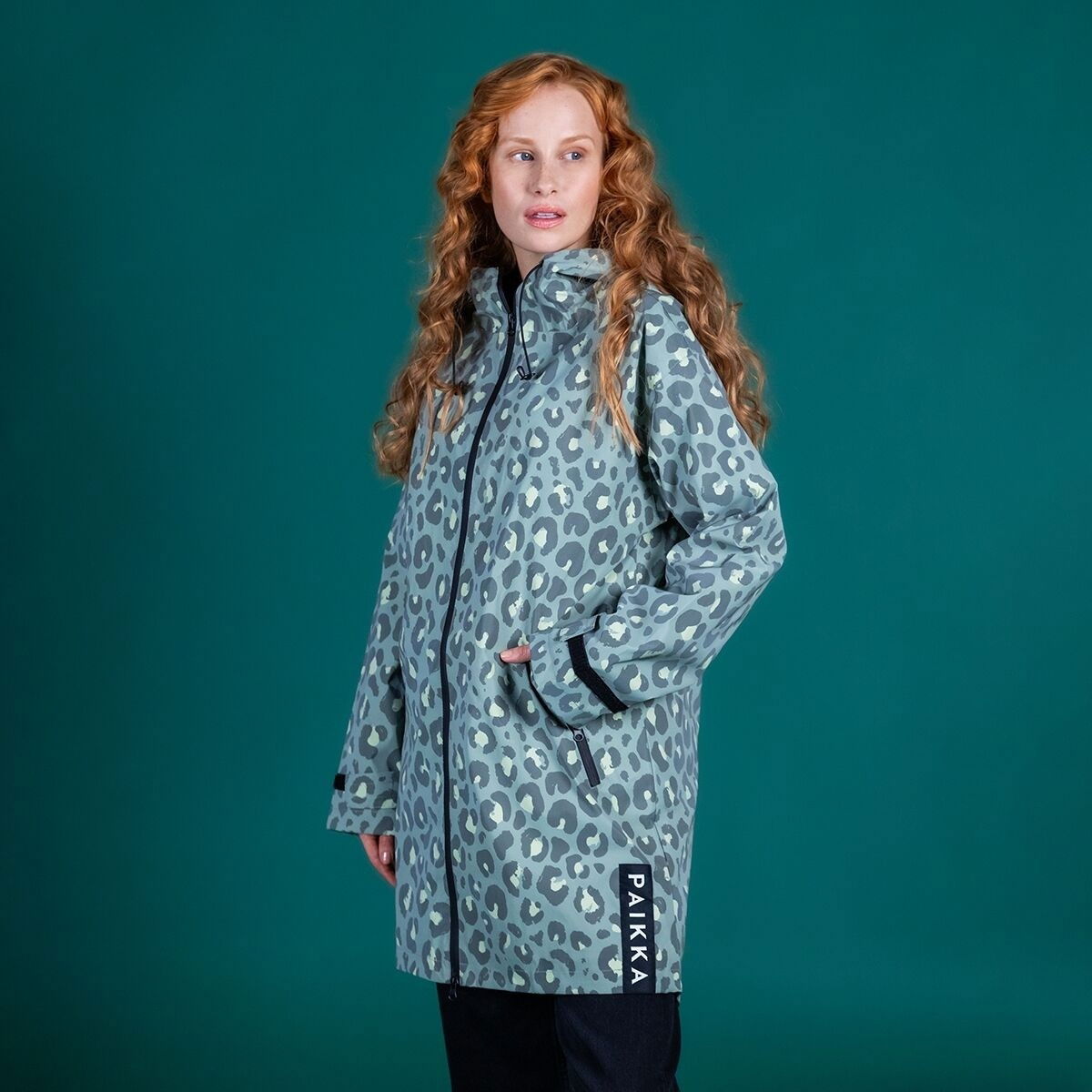 PAIKKA Sadetakki green leo on Suomessa suunniteltu sadetakki, joka yhdistää käytännöllisyyden, tyylin ja turvallisuuden. Näyttävä heijastava kangas lisää näkyvyyttä pimeällä, ja samalla takki suojaa sateelta ja tuulelta. Malli on naisellinen ja pidempi, mikä tuo suojaa myös reisille. Yhdistä tyyli koirasi kanssa – tästä kuosista löytyy myös PAIKKA-sadetakki koirille.
