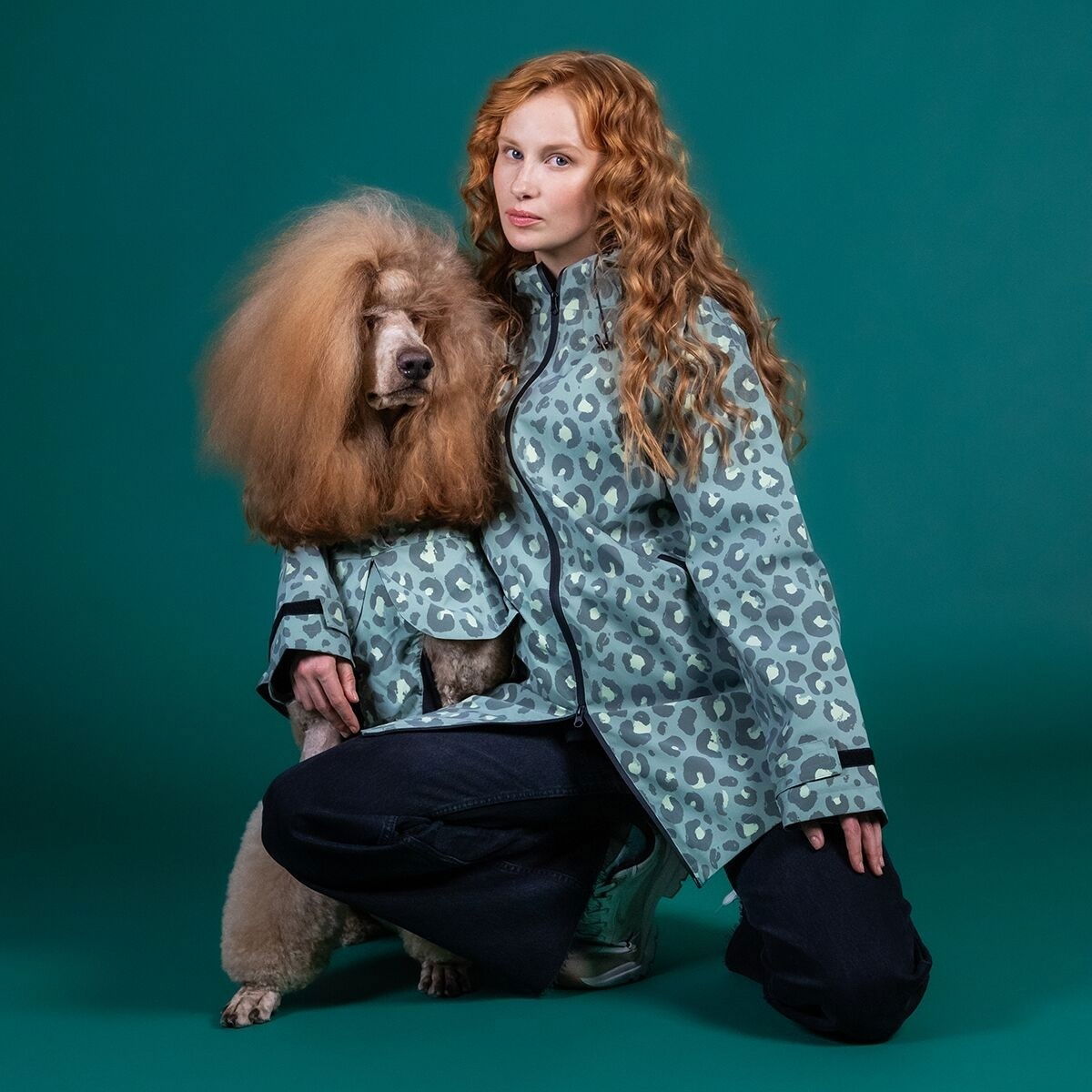 • Saatavilla samasta kuosista myös koirille oma sadetakki.
