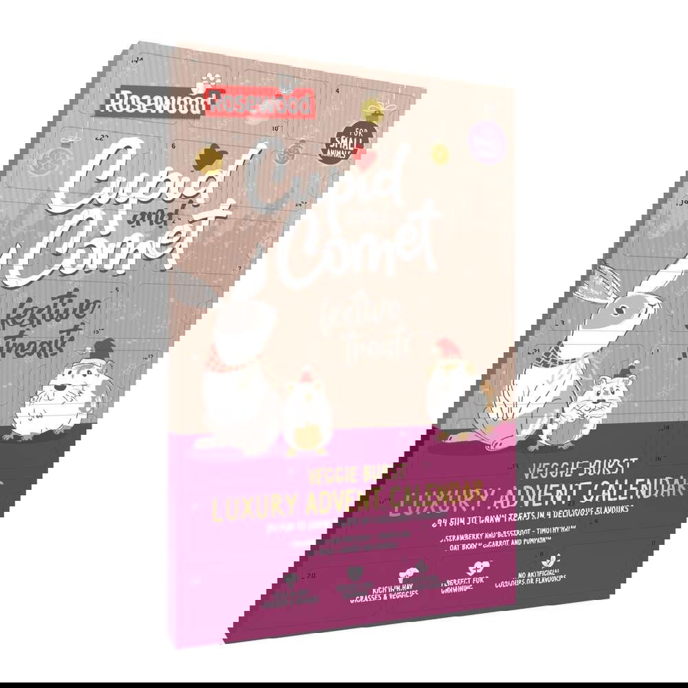 Rosewood-pieneläimen joulukalenteri tekee pieneläinten joulunodotuksesta herkullisen hauskan! Kalenterin 24 luukun takaa löytyy jokaiselle päivälle luonnollinen makupala, joka tuo iloa kaneille, hamstereille, marsuille ja muille pienille ystäville. Kalenteri sisältää suosittuja Veggie Burst -herkkuja, jotka on valmistettu heinistä, vihanneksista ja hedelmistä ilman keinotekoisia värejä tai makuja. Jokainen herkkupala on muotoiltu joulun hengessä – esimerkiksi tähden, kuusen tai sydämen muotoon – ja maistuu neljässä luonnollisessa makuyhdistelmässä: mansikka & punajuuri, timoteiheinä, kauralese sekä porkkana & kurpitsa.
