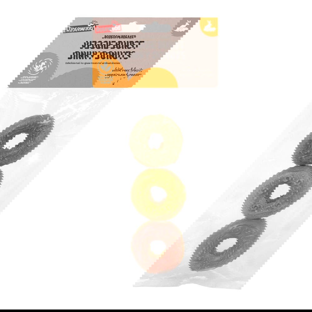 Rosewood Veggie Burst donitsit ovat donitsin muotoisia pureskeltavia herkkuja, jotka tuovat vaihtelua ja virikettä kanien ja jyrsijöiden arkeen. Donitsit on suunniteltu houkuttelemaan pureskelemaan, mikä tukee hampaiden hyvinvointia.