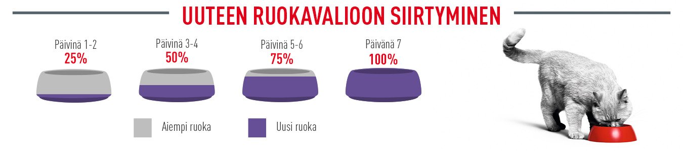 Uuteen ruokavalioon siirtyminen kannattaa aloittaa vähitellen viikon mittaan mahdollisten vatsavaivojen estämiseksi. Aloita antamalla pieni määrä uutta ruokaa vanhan seassa ja lisää osuutta asteittain, kunnes kissa saa pelkästään uutta ruokaa.