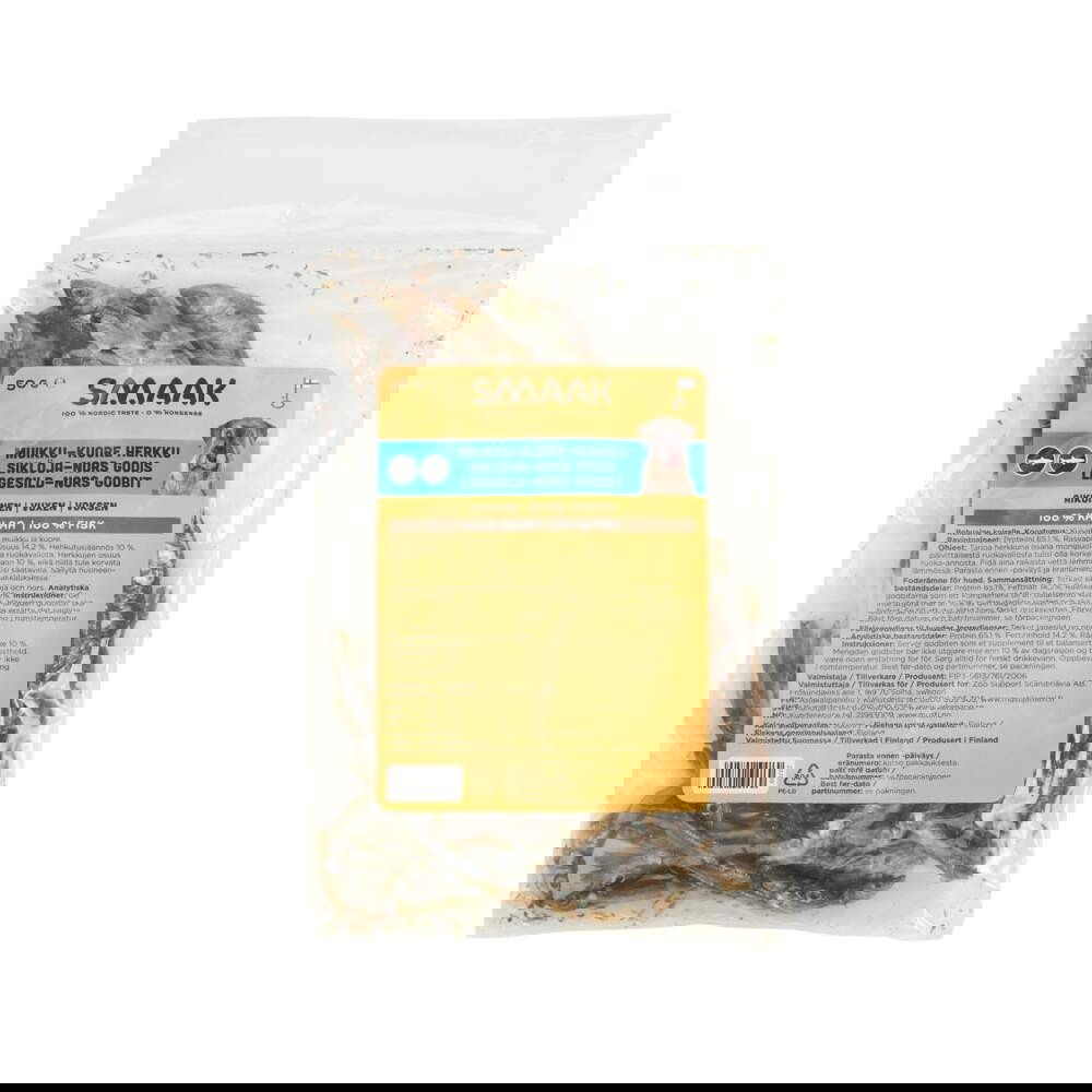 SMAAK Muikku-kuore on 100 % pienistä suomalaisista kaloista valmistettu kuivattu herkku, jossa ei ole mitään ylimääräistä. Herkut ovat rapeita, luonnollisen maukkaita ja täynnä hyvälaatuista proteiinia ja omega-3-rasvahappoja. Ne sopivat loistavasti sekä terveelliseksi palkkioksi että pieneen hemmotteluhetkeen kotona.