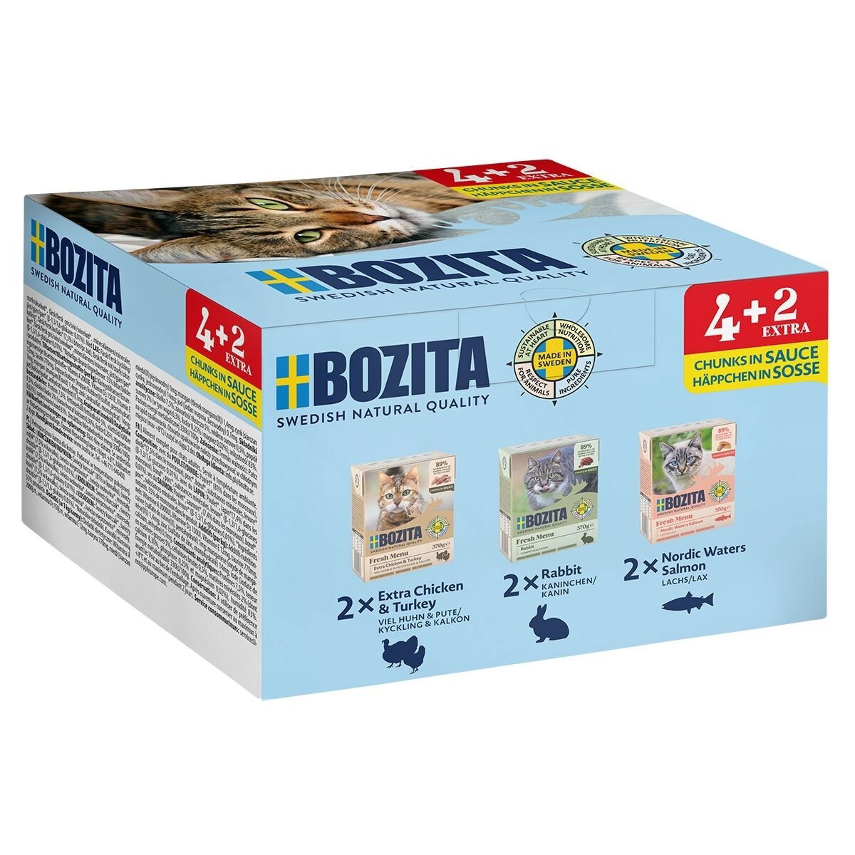 Bozita-kuivaruoat kissoille sopivat eri elämänvaiheisiin, aktiivisuustasoille ja erityistarpeisiin. Bozita Feline Sensitive Diet & Stomach Grain Free on viljaton ja se voi sopia myös herkkävatsaisille kissoille. Bozita-märkäruoat kissoille tetroissa ovat ympäristöystävällisesti pakattu ja ne sisältävät jopa 93 % lihaa. Runsaasti makuvaihtoehtoja: kana, kalkkuna, nauta, kala, äyriäiset, possu, hirvi, lammas, poro, jänis ja ankka. Bozita-kissanruoat tarjoavat vaihtoehtoja joka makuun!